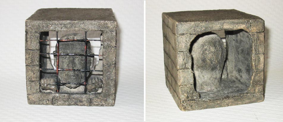 oder "Über unsere Lieblingsbeschäftigung". Geschrüht, mit Braunstein gefärbt und gewachst, Kantenlänge 11 cm)