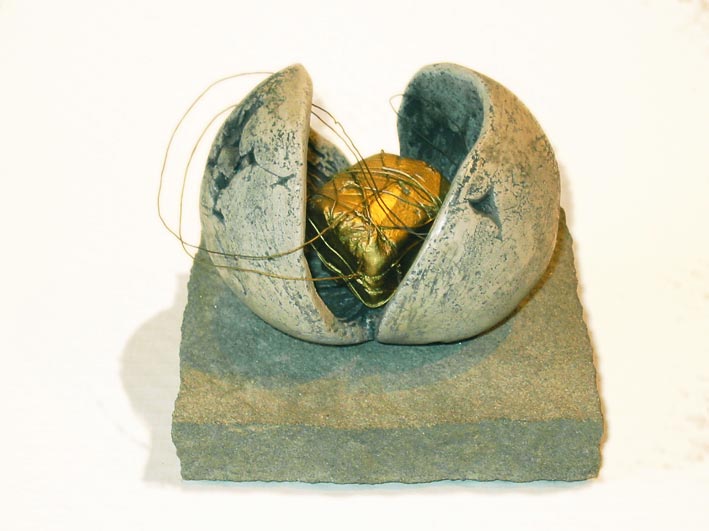 Mit Messingdraht geschrüht, teilbemalt. Sandsteinsockel. Höhe 12 cm
